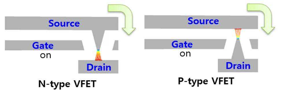 当连接到公共输入电压时,它们以相反的方式工作:当一个晶体管导通时,另一个晶体管截止。由于在沟道中没有用于掺杂的半导体材料,也没有可能制造P型器件的空穴,因此VFET的互补操作无法实现。