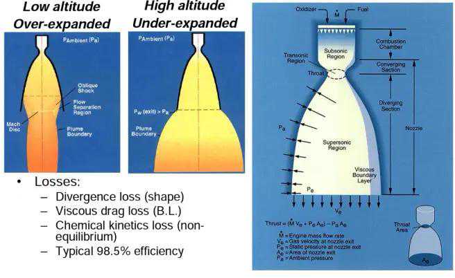 SSME引擎的改动使得喷管中边缘处的气流得以维持足够的压力(32-39KPa),同时中间部的气流充分膨胀到更低气压14kPa来增加流速(也就是比冲)。