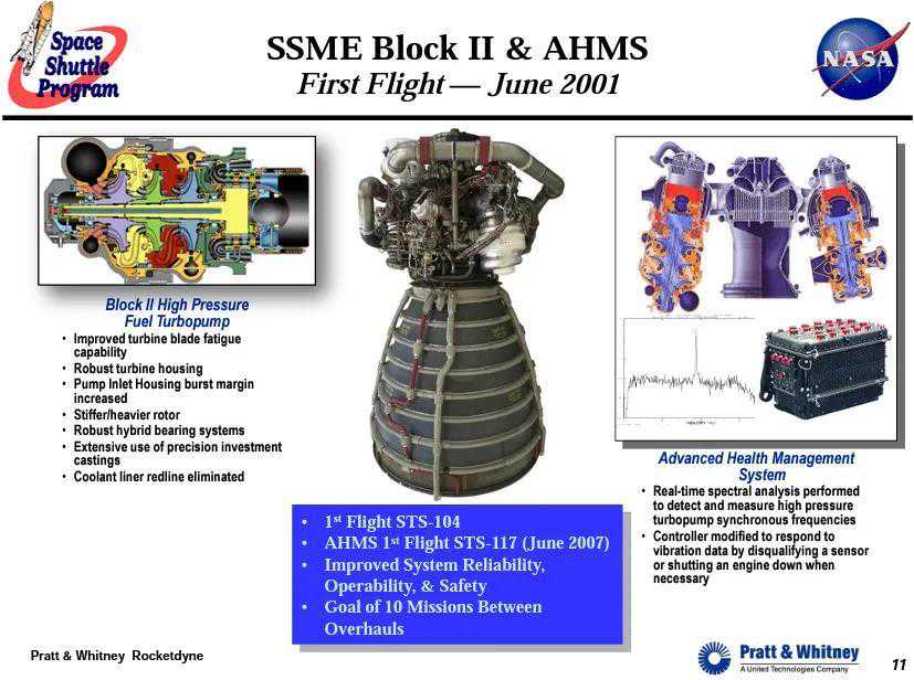 最后一型对引擎工作硬件的大改,BlockII相比BlockIIA给SSME引擎更换了一款先进的高压氢涡轮泵(AdvancedHPFTP)。类似于BlockI对HPOTP的改进,BlockII的改进也是由NASA单独授予PW研发合同的产物。同样的使用了最尖端的材料和工艺,显著提升了可靠性和安全性。