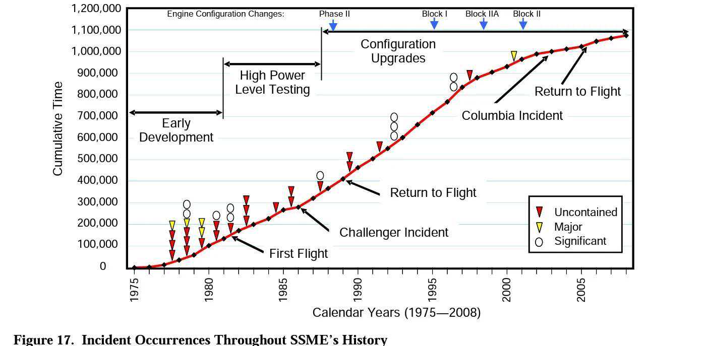 从1975到2011,SSME累积了接近110万秒的试车时间