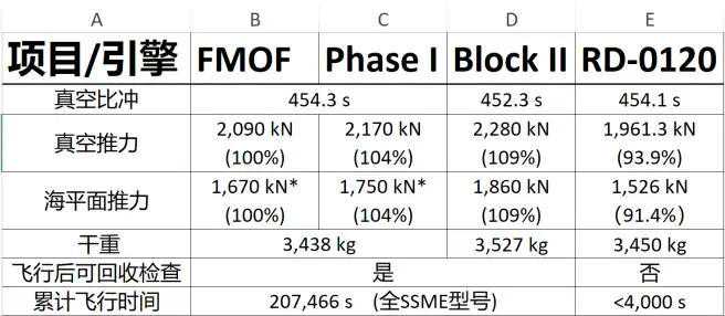 我们都知道RS-25在BlockII时代用2秒比冲换了5%的运行推力,为了避免复杂的计算,我们选取FMOF引擎,PhaseI引擎,BlockII引擎来与RD-0120进行比较。我们也会将RD-0120的全推力(106%)以FMOF的100%标准推力为分母换算成百分比形式来进行比较。