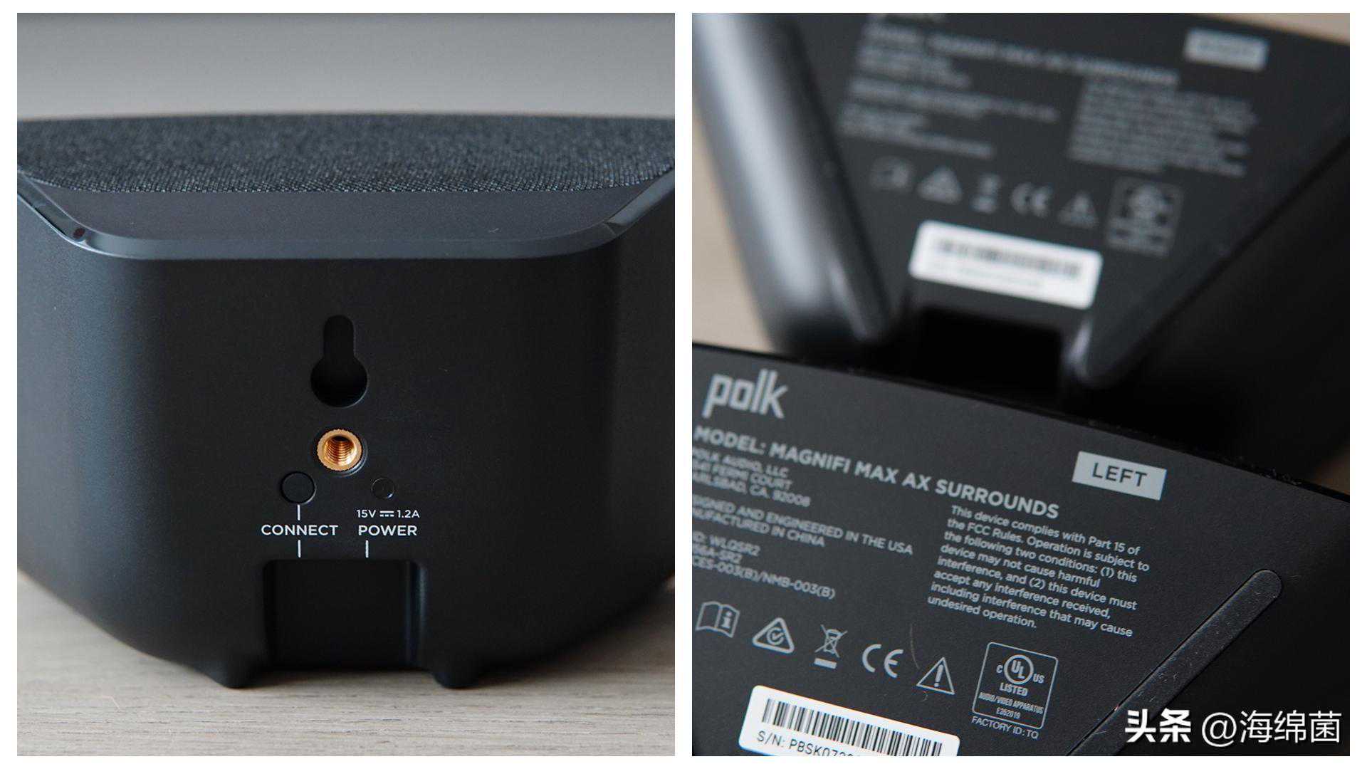 采用无线连接插上电源线就可以使用,也留有上墙接口可以上墙安装。注意两个环绕音箱是分左右的,底部有标注。