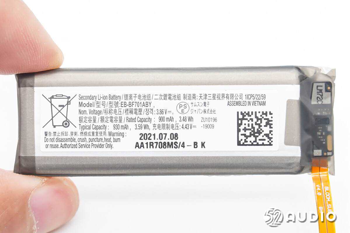 下方腔体内置锂离子电池组,型号:EB-BF700ABY,标称电压:3.86V,额定容量:2300,充电限制电压:4.43V,制造商:天津三星视界有限公司,越南制造。