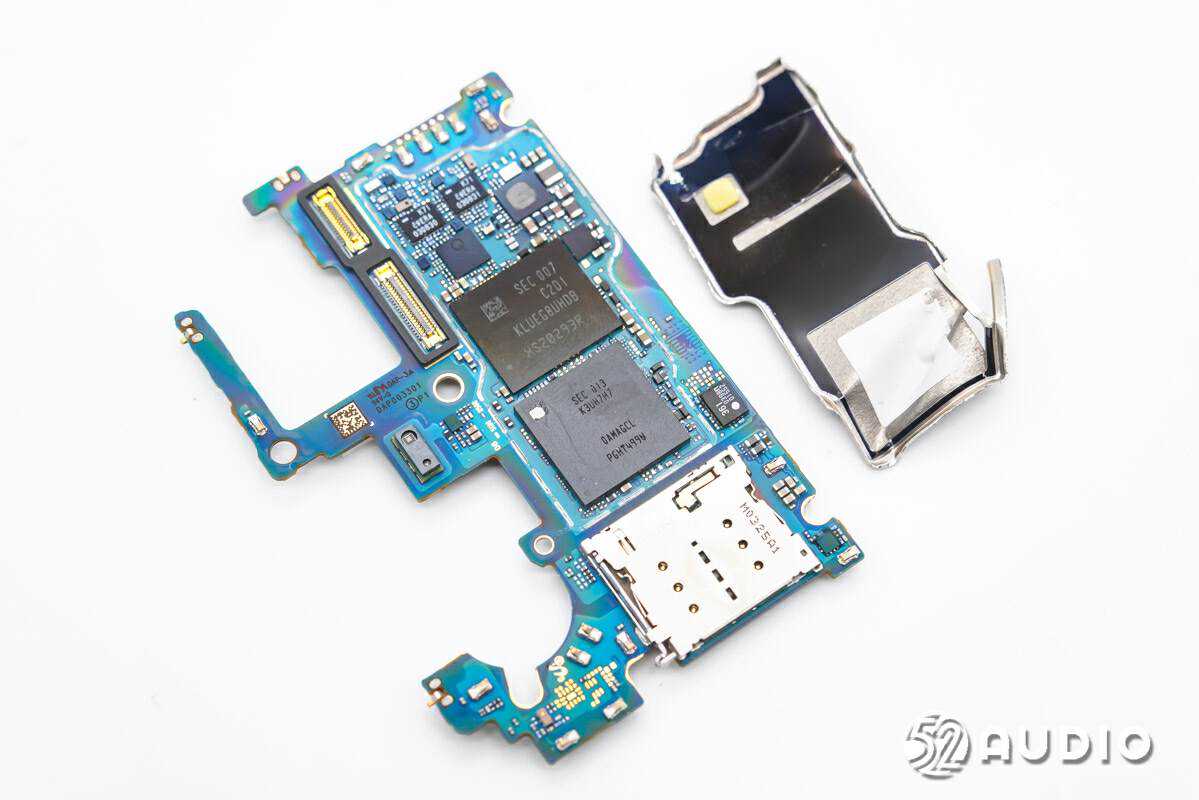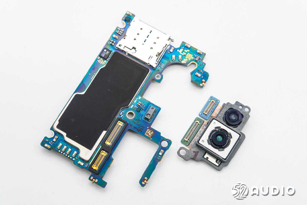 手机主板采用堆叠式设计,从而大幅节省机身内部空间。主板一侧设置有屏蔽罩防护,边缘固定有摄像头模组。