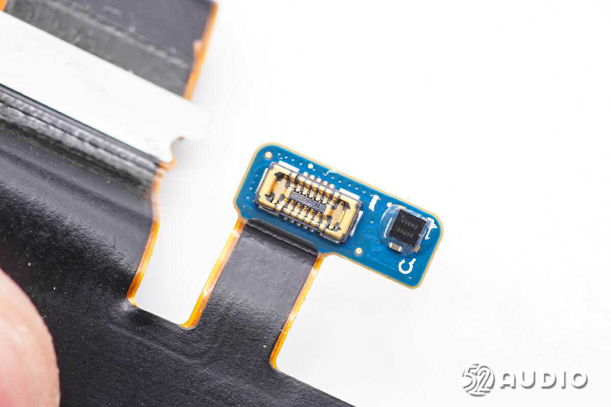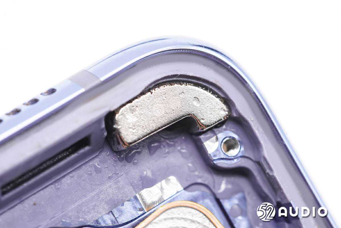 右上角的磁铁特写,采用了契合腔体的异形设计,高精度的尺寸和适当的材料选型满足吸力要求。与右下角的磁铁呈相对向异极,主要作用为磁吸附,保障折叠屏手机开闭屏时的稳定性。