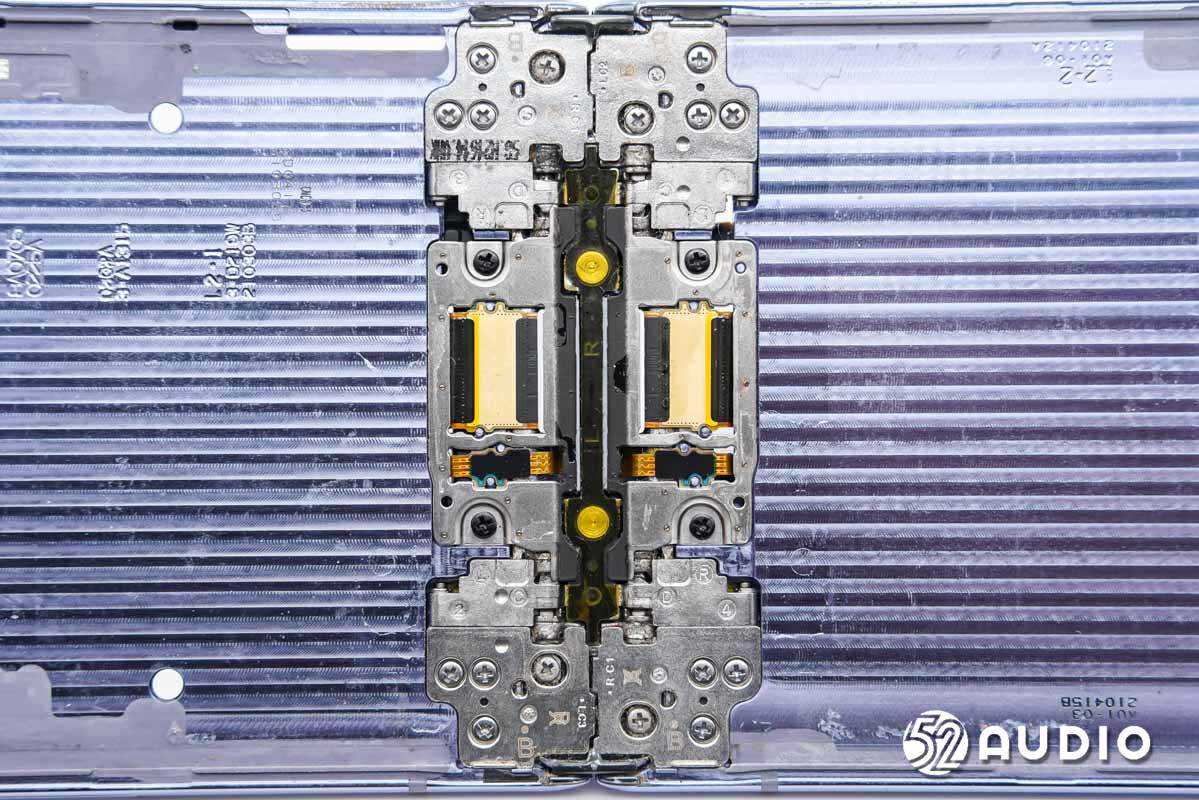 腔体内部结构一览,元器件通过塑料支架和金属压板固定,腔体内部同样设置有一块电池。