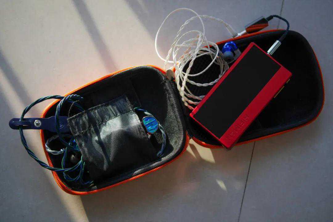 这就是我最近出差时的音频装备包:里面除了这台“胭脂红”(官方名称)的HM1000播放器外,还有两条常用的耳塞:瑞弦的VR1和自然声。两条耳塞本身都是2.5mm平衡口的,统一用转接头转到4.4mm平衡连接HM1000胭脂红。而过往,装备包里的这个位置通常是留给HIFIMANR2R2000太子播放器的。