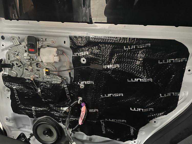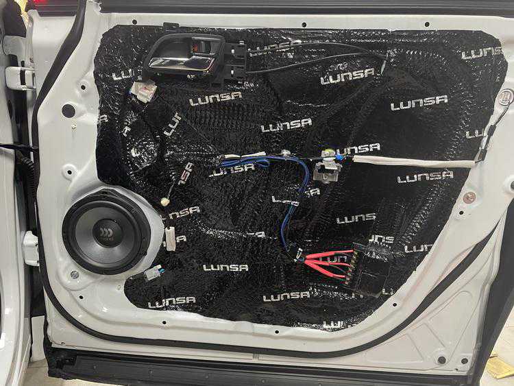 在使用伦萨隔音材料,对门板做了隔音处理后,技师将前声场喇叭,升级成为摩雷听爱卓602,这套喇叭的中低音单元使用的是一体化盆架,很大程度上减少了反响失真,保证了音乐的真实性;而丝膜球顶设计的高音单元则可以拉高整体声场,让音乐显得高亢靓丽。后声场使用的摩雷柯蕾602C,则具有灵敏性高、同步性好等特点,可以与前声场形成优势互补,让音乐的综合表现更加理想。