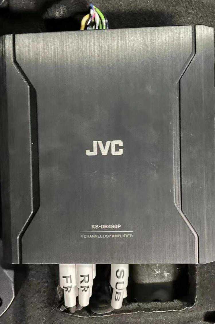 在音源端,技师为汽车添加了一台JVC480处理器,它可以过滤主机工作产生的杂音,使得音频信号更加干净,而为了保证功率输出的稳定性,技师则为声场喇叭添加了两台功放。