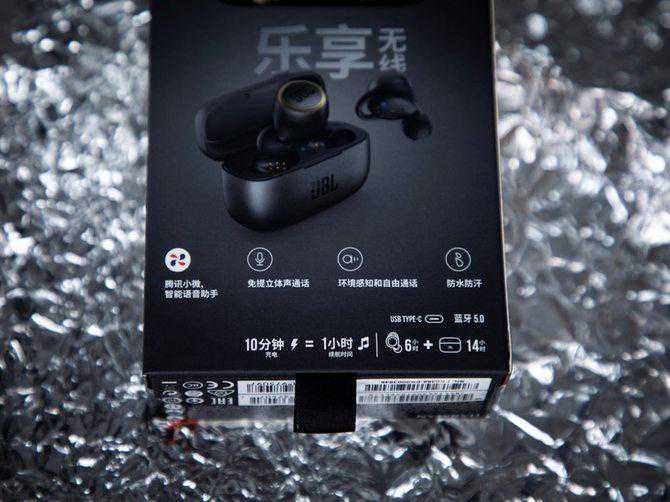 首先包装上的话,我们可以看到正面是耳机渲染图,同时还有JBL品牌标志性的橙色点缀,右上角是产品型号。在左下角是支持腾讯小微、QQ音乐,并且采用了蓝牙5.0技术,右下角是续航时间,总的来讲这款耳机包装展示的参数还是比较全面的,让人能够一眼捕捉到关键的参数信息。