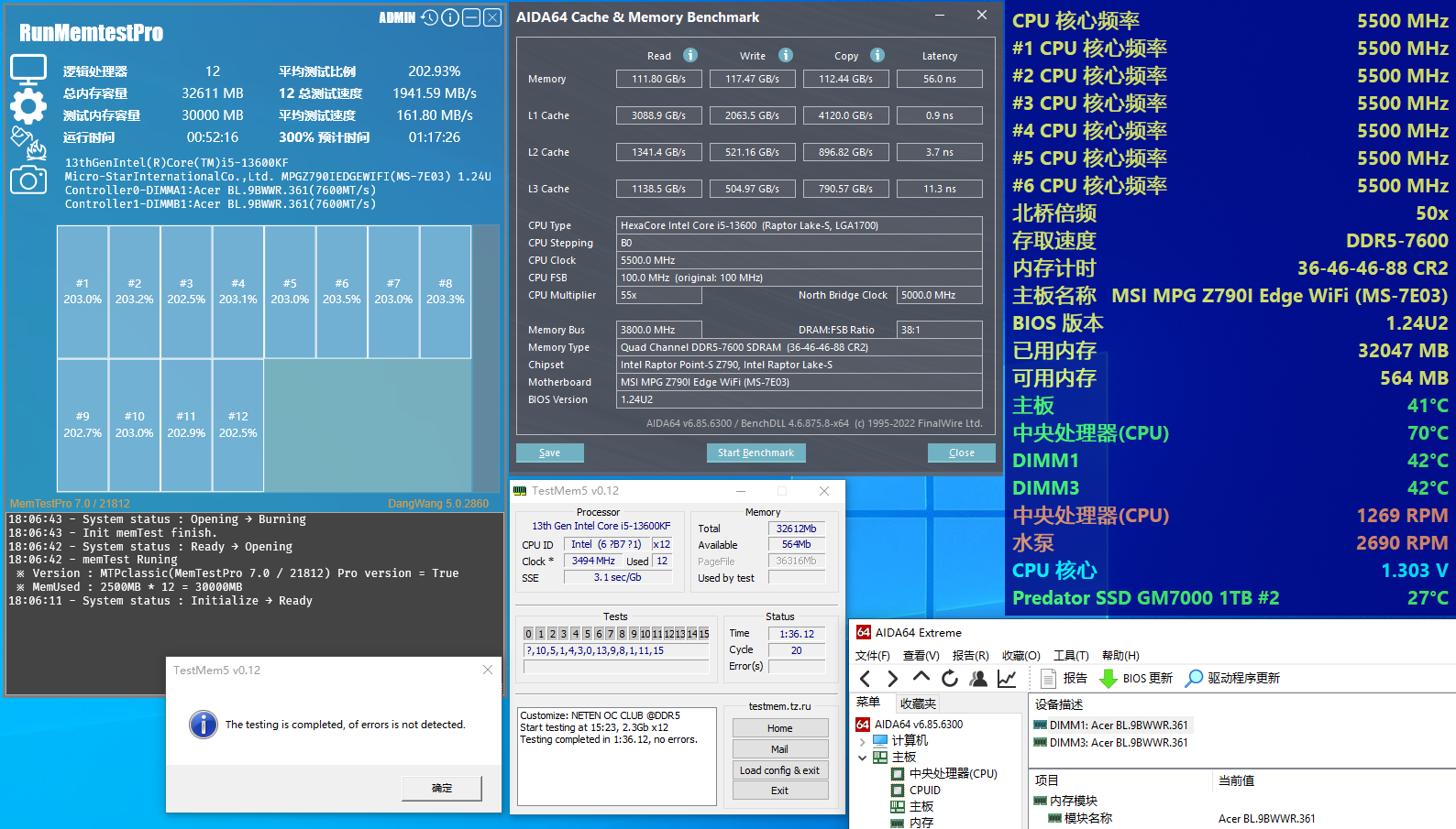 ▲内存超频7600C36,小参优化后(和前面7800小参一样),读取111.23GB/s,写入117.27GB/s,复制111.97GB/s,延迟51.8ns,非常接近7800C34的数据了,差距仅有3%左右,而内存电压仅需1.48V。
