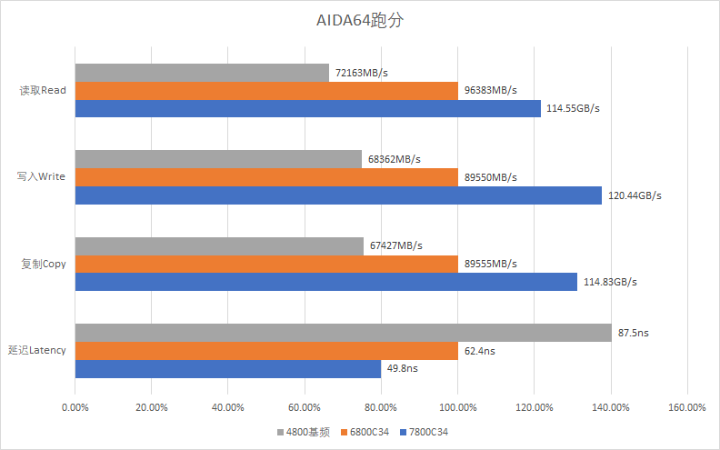 7800C34:读取114.55GB/s,写入120.44GB/s,复制114.83GB/s,延迟49.8ns。