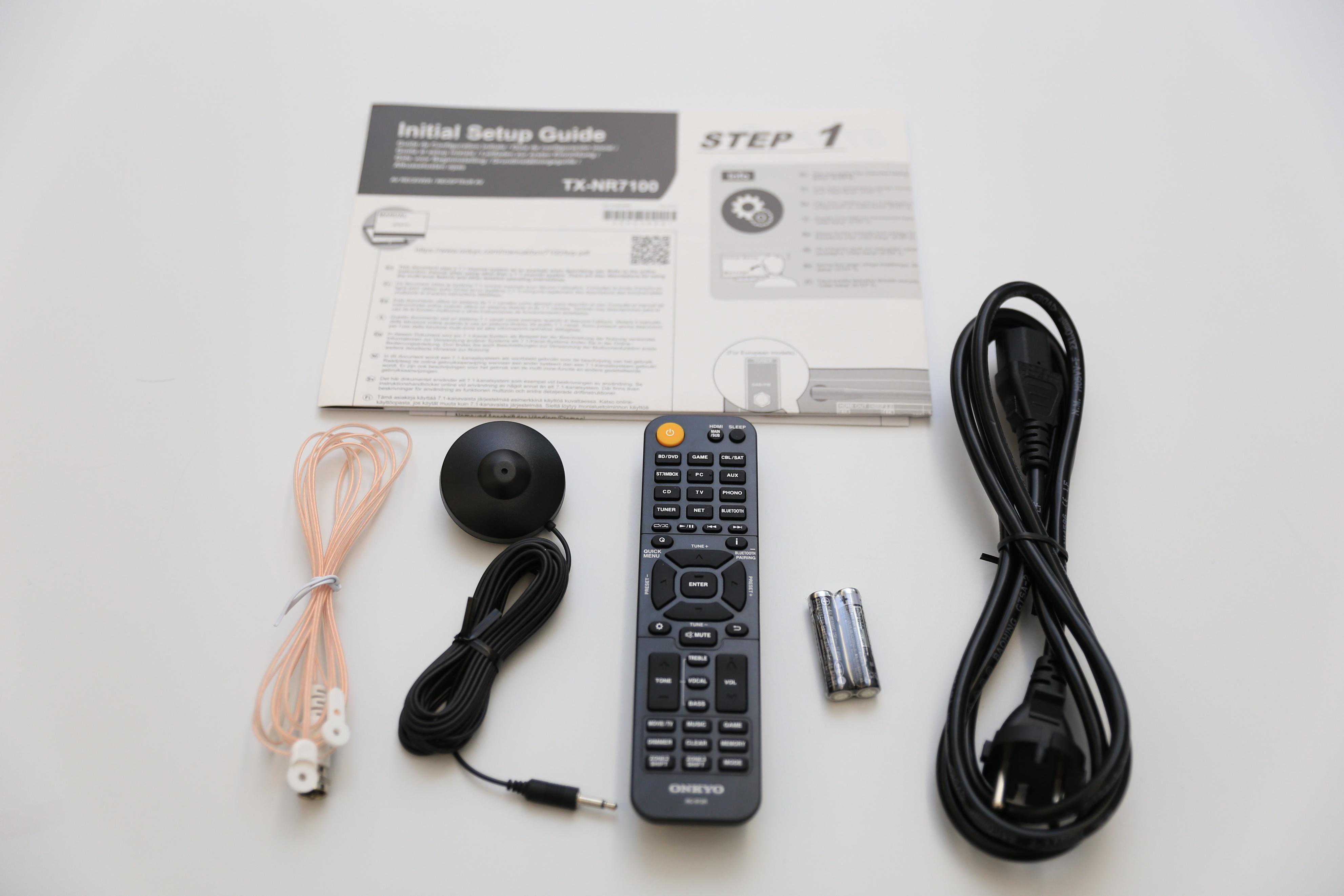 所有配件拿出来,电源线、遥控器、测试麦克风、收音机天线和很简单的上手指南。