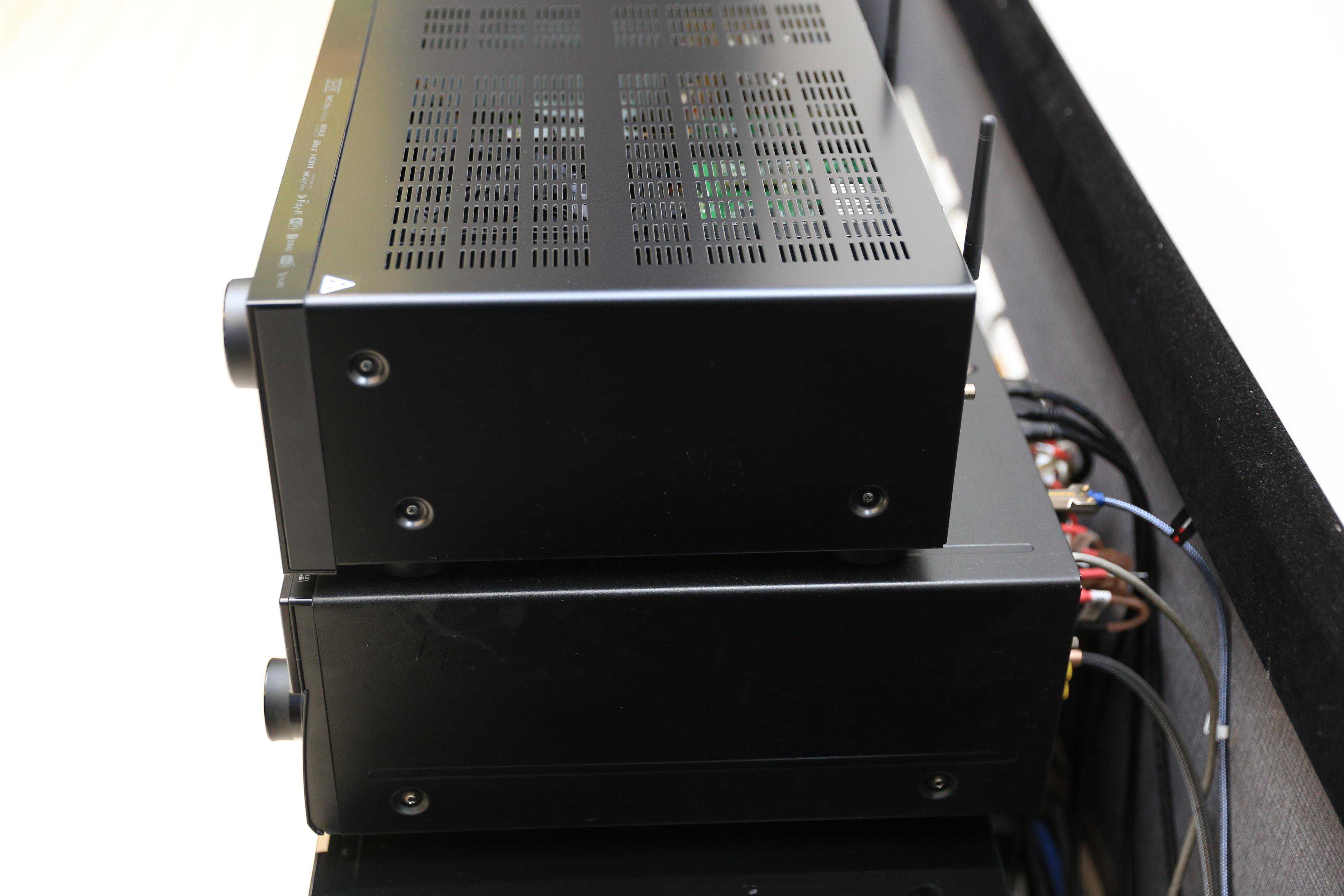 从侧面瞟一眼,定位万元价位的中端R7100比起旗舰功放明显就短了一截,定位如此。