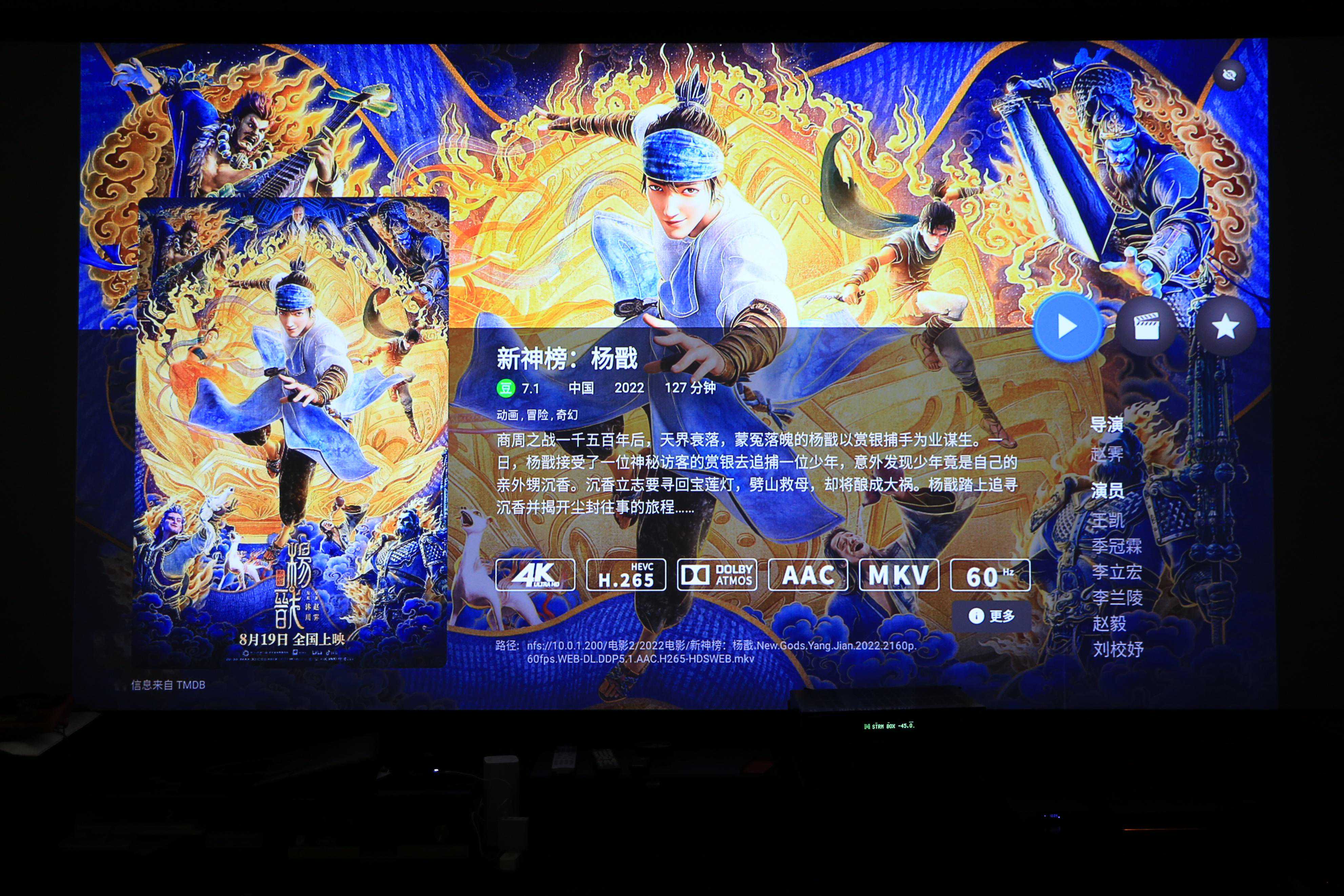《新神榜:杨戬》是带着娃一起看的,WEB版本资源,音轨是半码的全景声,但这条音轨的素质还不错,片中有挺多的针对全景声做过声音优化的镜头,声场的纵向空间感不错,打劫“银行”和塔上打斗的场面,都有比较丰富的顶置声音信息,R7100对声场的营造还是比较宽广的,声音定位感也没问题。