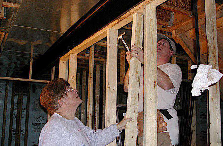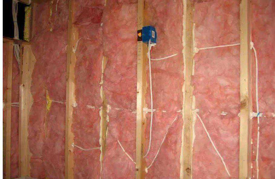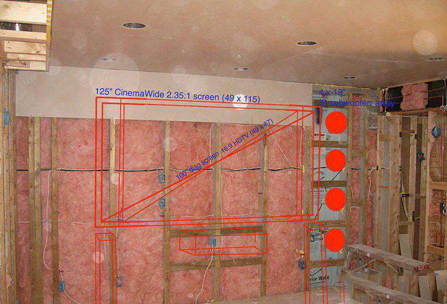 Mike利用木质条柱和相互交错的壁骨搭建了影院墙壁,然后填充隔音材料。由于,影院后墙壁毗邻上楼的走廊,于是他在墙壁两边大面积的安装双层石膏板。