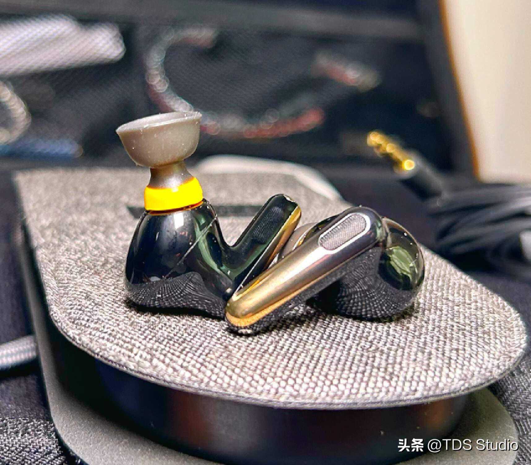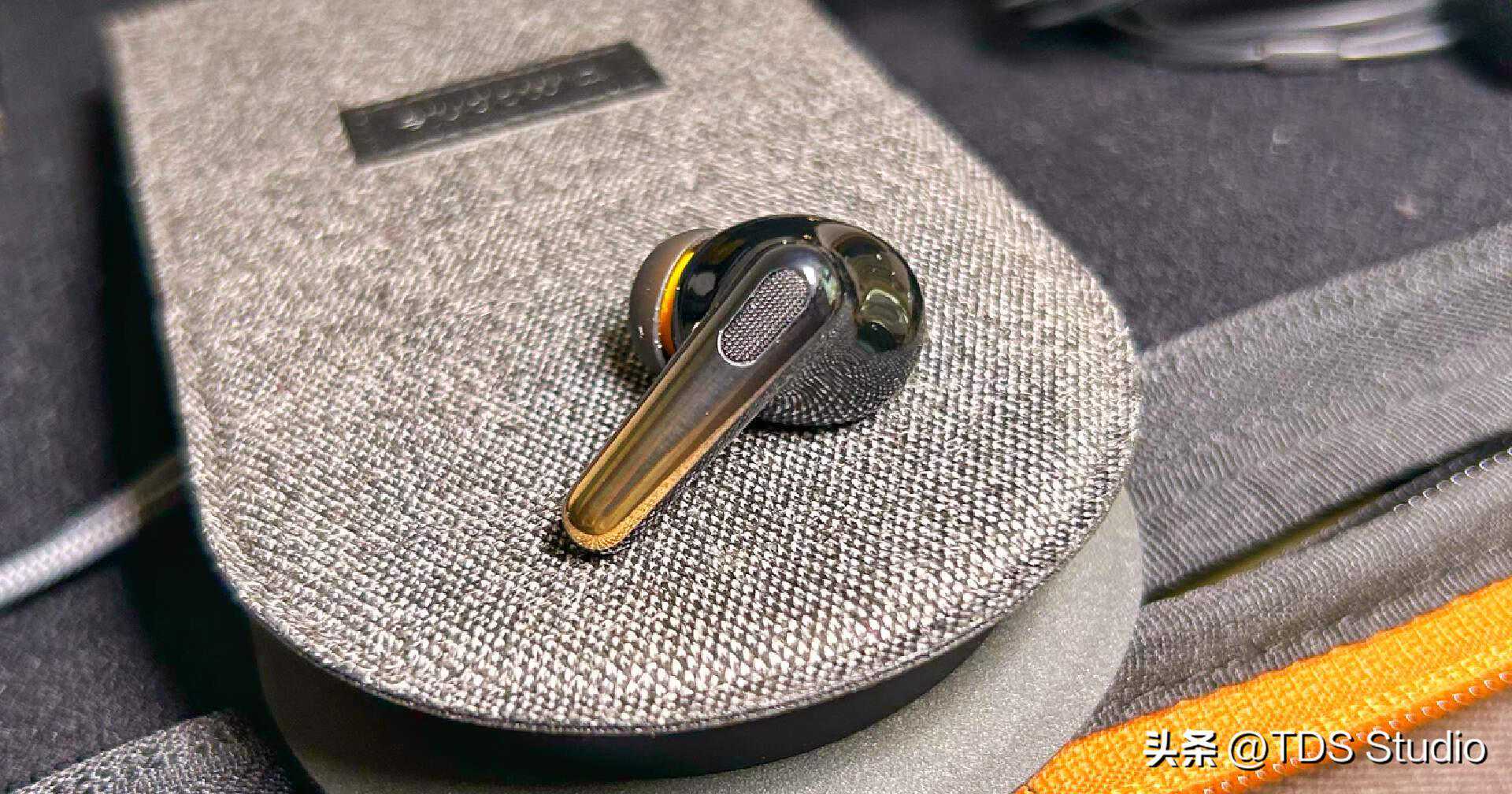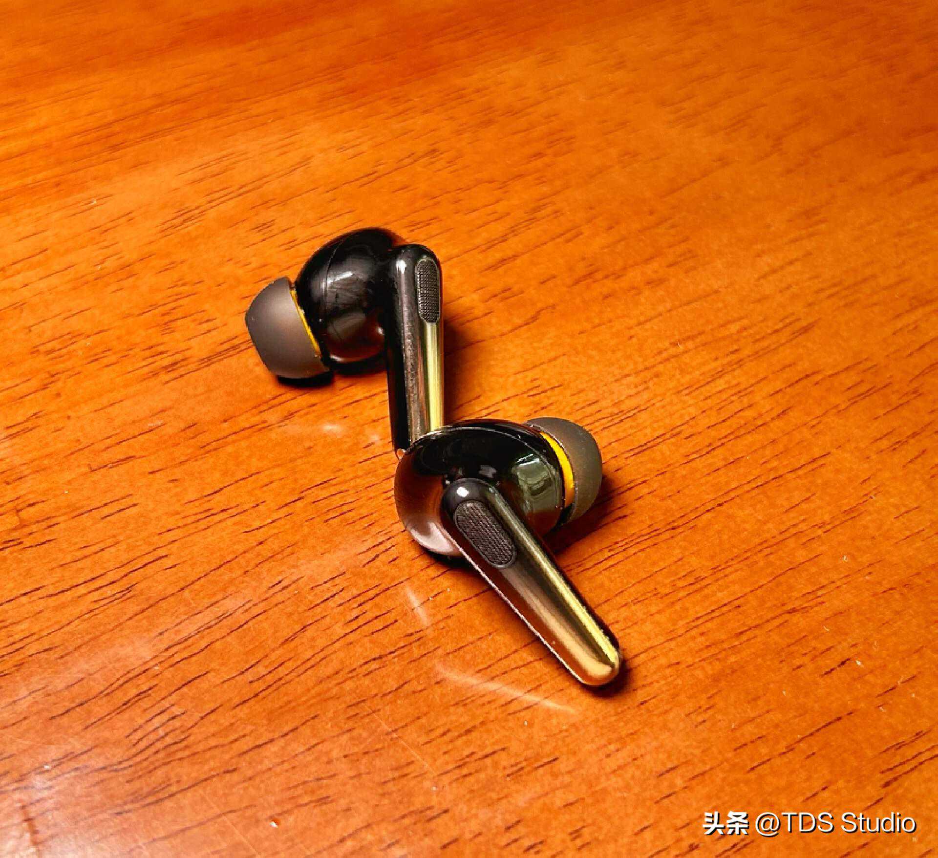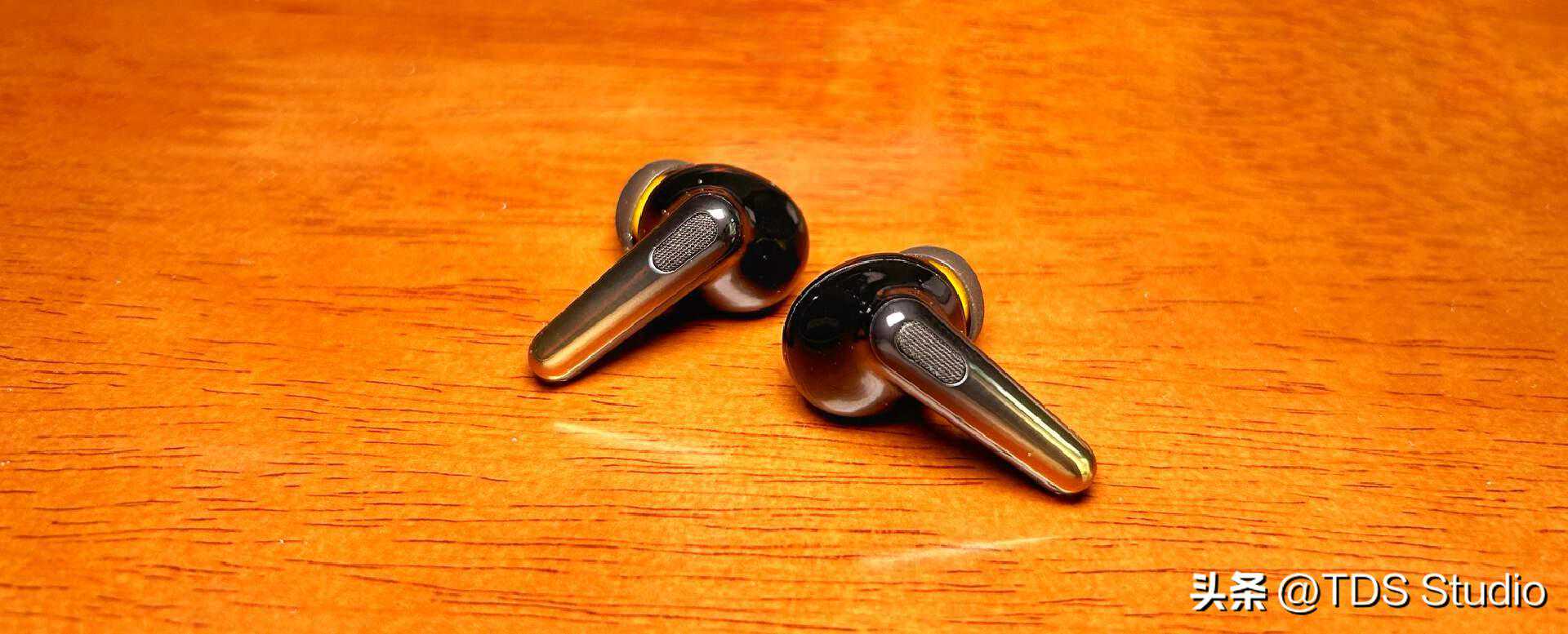 耳机本体是相当光滑的“pods”形态,柄部做了从黑色到金黄色的渐变,这个小点缀倒是给黑色的腔体加了一些趣味。柄部内侧的操控区域有轻微的凹陷和点状纹路可以方便盲操。腔体的饱满程度与TWS3、AirPodsPro2等近似,基本上是一个内侧贴合度较高,相对不会特别顶着耳甲腔外缘的状态。稳定性在带柄pods形态TWS中属于还不错的,腔体不算重,舒适性没什么问题。