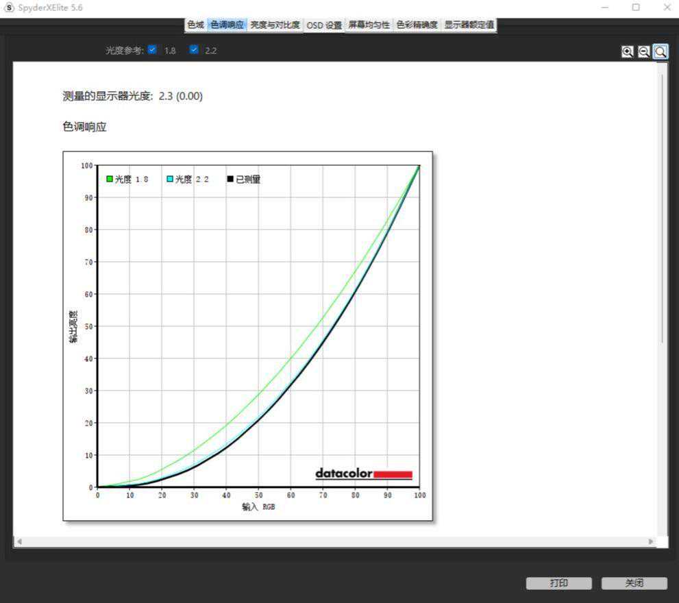 ▼显示器光度测试,曲线和2.2曲线几乎完全重合,效果不错。