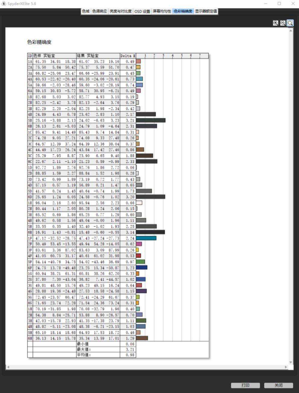 ▼色准表现,平均ΔE=0.98,最大ΔE=3.21,整体的色准表现非常不错。