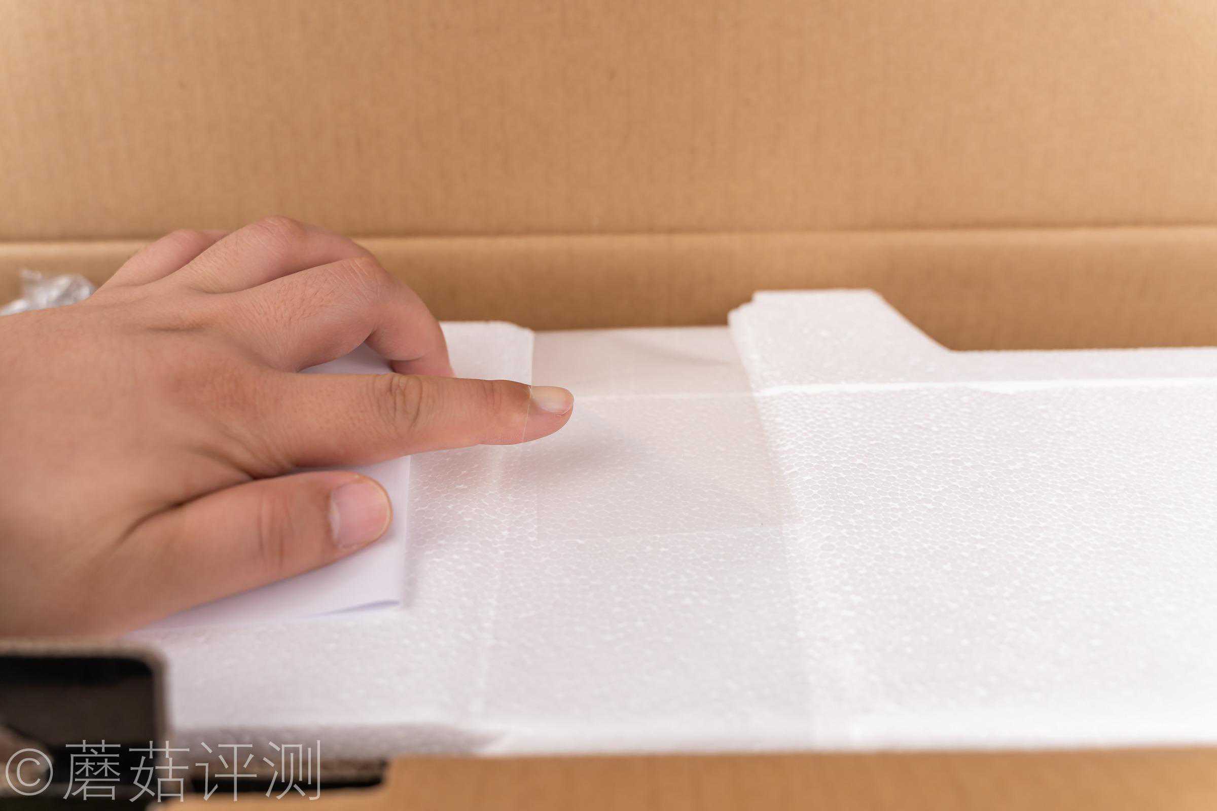 ▼打开纸箱,内部的泡沫也有透明塑料提手设计,可以非常方便的将内部的显示器拎出来。