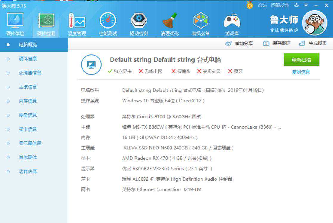 Inteli38100,光威16G内存,硬盘是科赋的240GSSD,主板铭瑄的B360W.