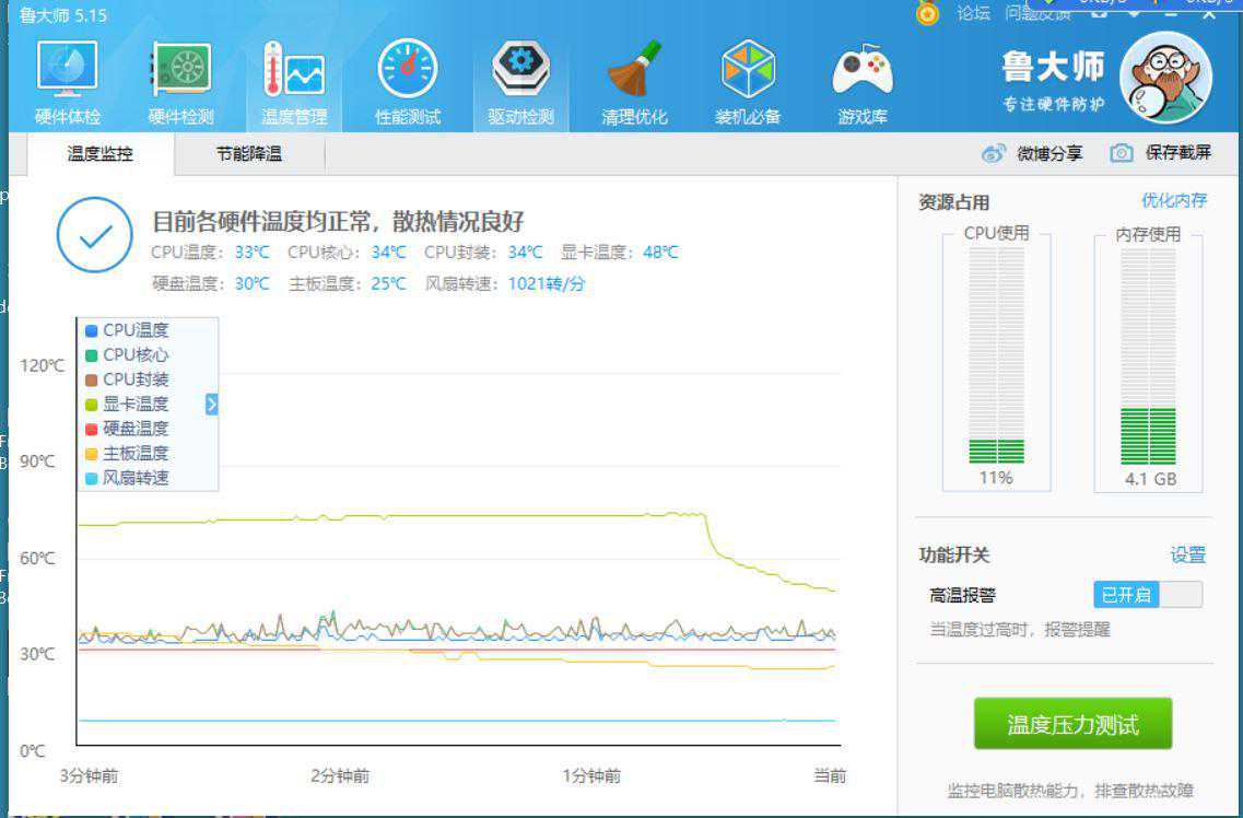 看看鲁大师的温度曲线,还是比较平稳的。面包圈烤完后温度直降到40度。