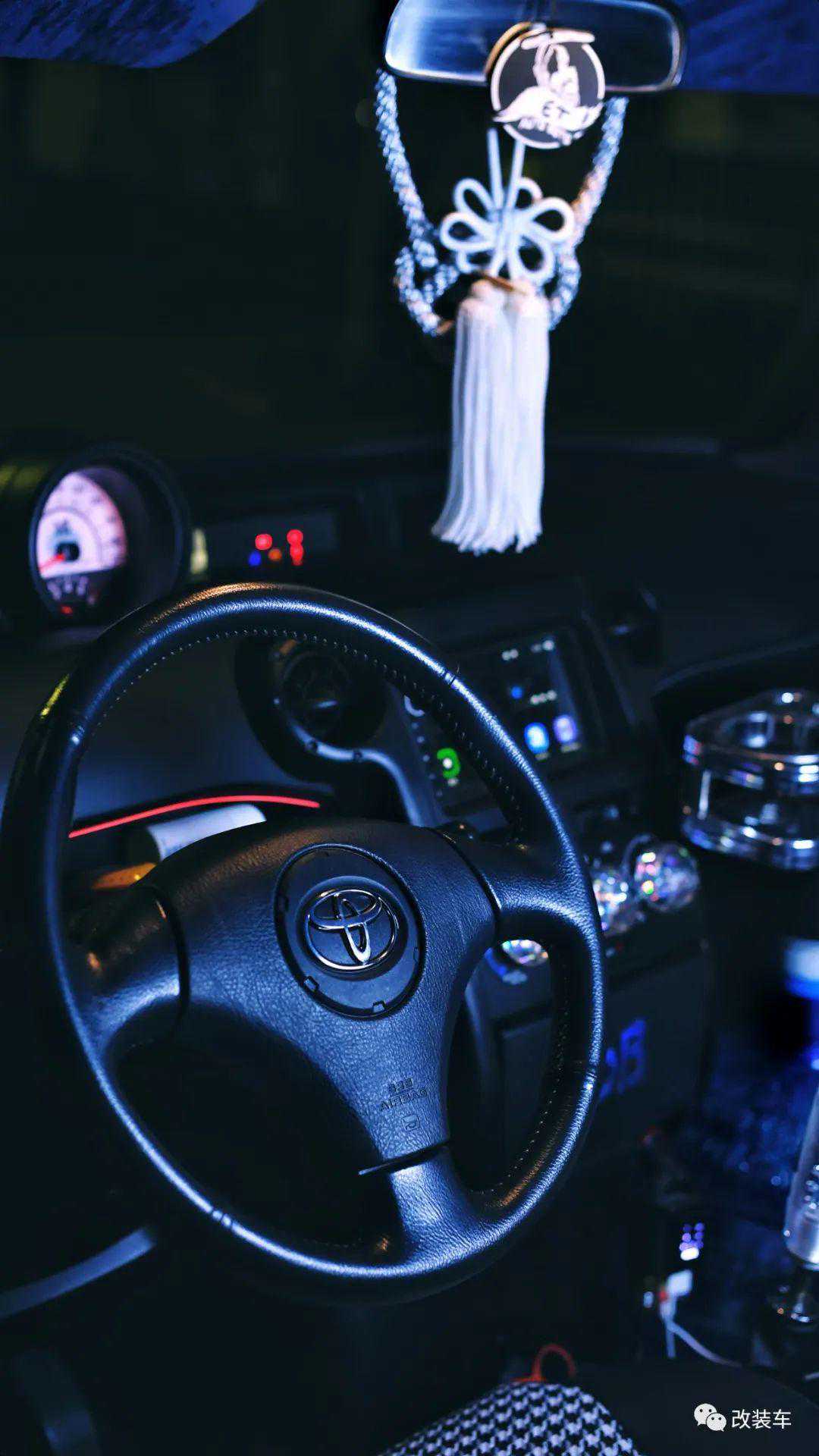 "外观变漂亮了,内饰当然也不能马虎啦!换上了千鸟格座椅、吧台水杯架、七彩氛围灯、水晶档把头、丰田方向盘、日规丰田bB折叠杯架、丰田bB日规仪表、无线CarPlay车载、翻毛皮顶篷等等,整体搭配的还是蛮有味道的。"