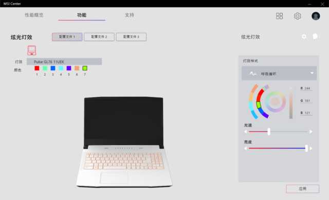 对于键盘背光有需求的小伙伴们来说,微星内置MSICenter,玩家可通过该应用对背光键盘进行颜色自定义的设计,并且还可调整多种灯效样式,满足热爱RGB的玩家进行个性化设定。