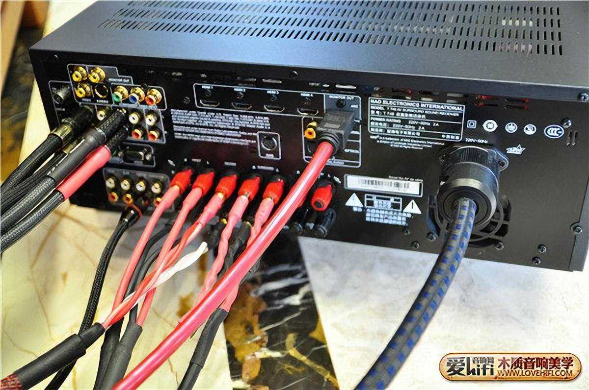 接线后的效果图。左边两组音频线,分别是:最左边的是机顶盒到功放的音频线,用户看普通电视节目时听的声音,电视机喇叭做得再好也比不过专业音箱喇叭;右边上黑下红的音频线(霍鲁斯Horus黑金刚纯手工HIFI做音频信号线)是连续巴鲁007+的,是用于听音乐的。下面单独一条,是低音炮线。中间五对线分别依次为前置(右、左)、中置、环绕(右、左),最右侧单独一条的是香港MQAC3K发烧电源线。中间应该是两条GoldensoundHDS-48006N无氧铜镀银的HDMI高清4K3D线,图中接的是输出端,连续到电视机去的。(还有一条等安装时才想起忘记在老巢了,后补)。