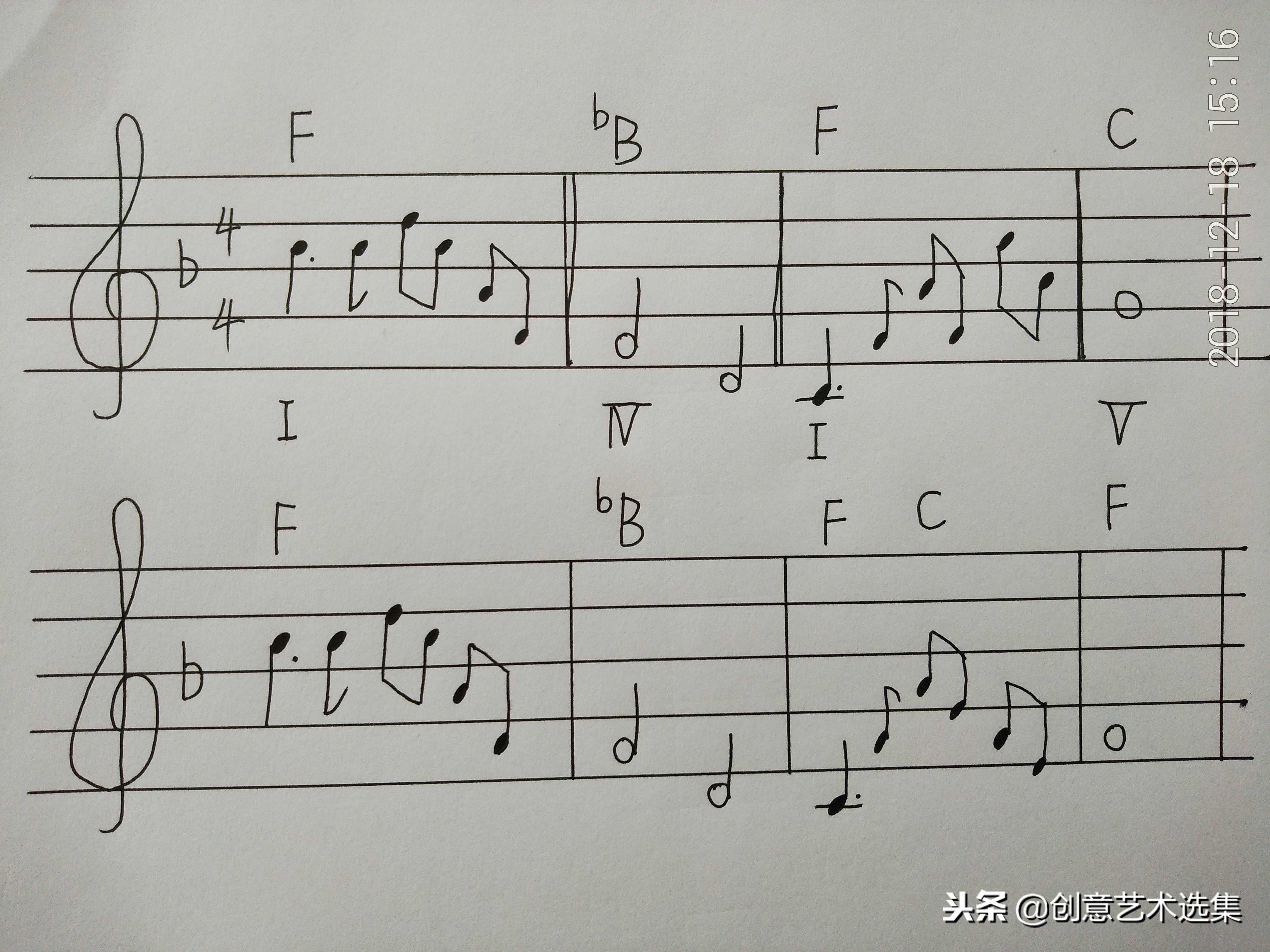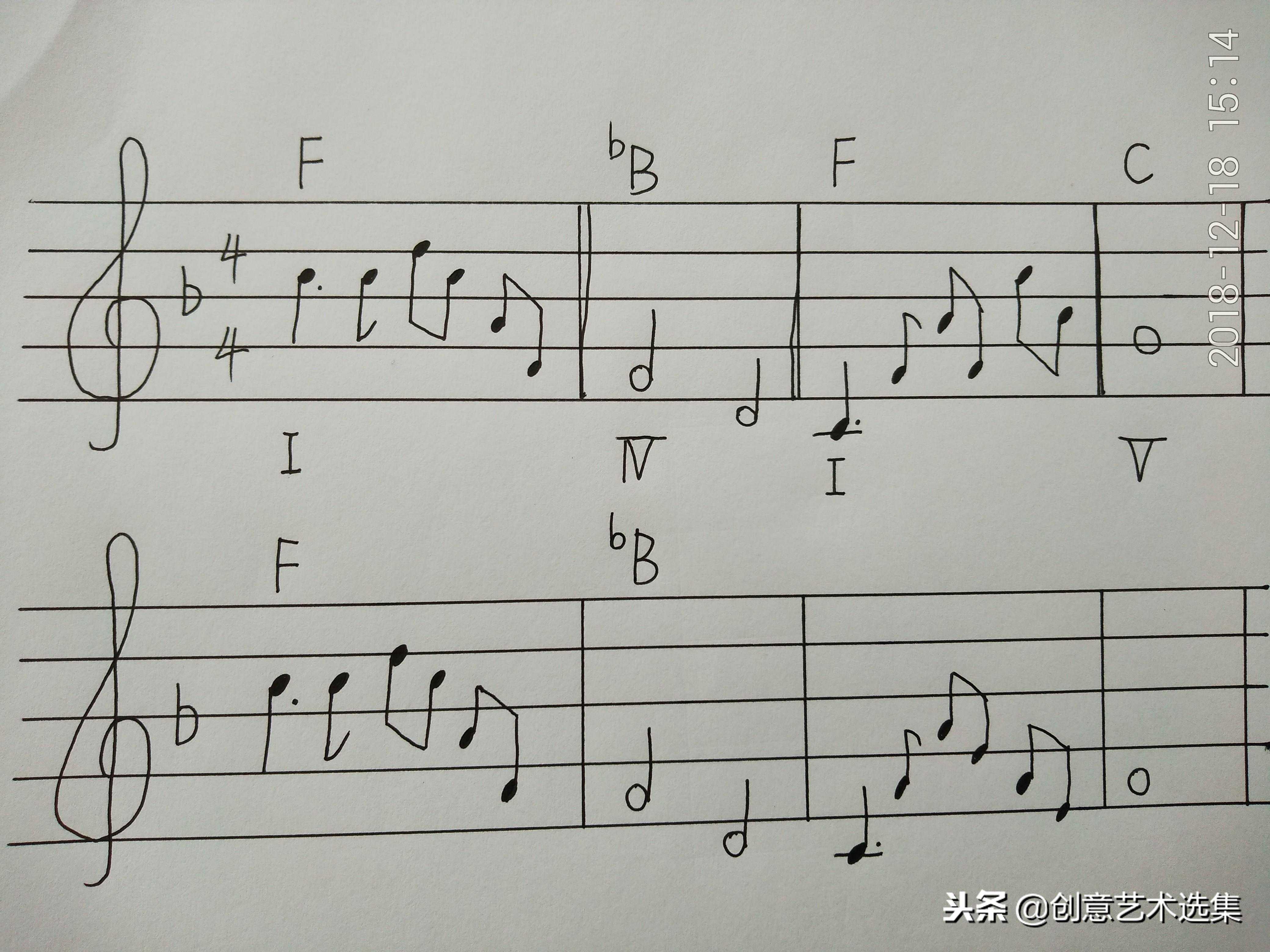 F大调配和弦这是一首F大调的歌,44拍。而且这是二段式的歌:aa’ba’,意思是第一行与第二行基本一样,第二行与第四行一模一样,第三行是别的旋律。