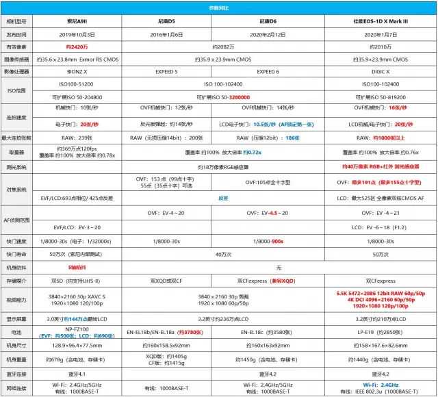 尼康以“功能强大的自动对焦旗舰机型”为题,可见此次D6的升级重点在对焦系统上。传统体育机升级思路无非五点:1.对焦系统;2.连拍速度;3.图像处理器;4.像素(画质);5.网络传输。上代D5可谓五大要点全面升级,D6的升级涉及三点:105点全十字对焦系统、14张/秒高速连拍、EXPEED6图像处理器。网络传输上,D6支持与D5相同的1000BASE-T以太网标准,官方称其传输速度提高约15%,这算改进项目,总体来说D6的升级幅度大于“s”级升级(如D3→D3s、D4→D4s、)小于等于整代升级(D3→D4、D4→D5),那么这次D6具体升级了什么?与上代D5有何异同?与竞品EOS-1DXMarkIII、A9II相比又如何?下面笔者对比一下四款产品的纸面规格: