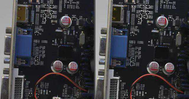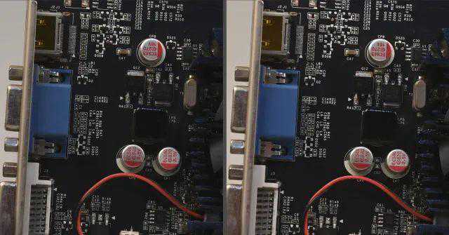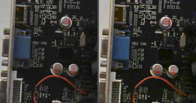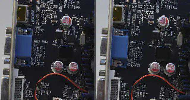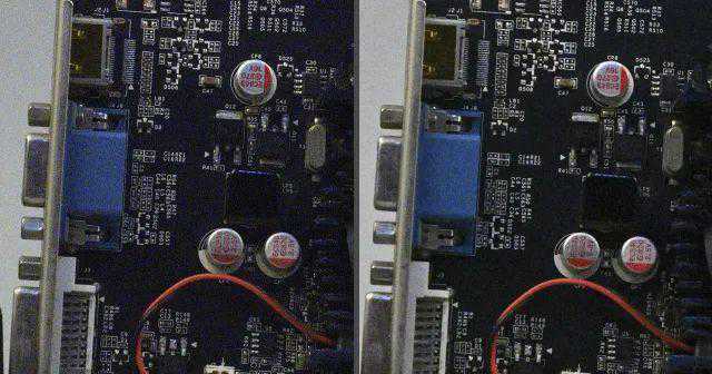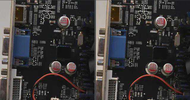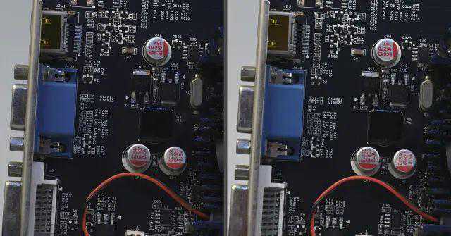JPG直出由于机内降噪处理,在噪点逐渐增加初期能够很好保证画面“干净”,ISO3200-6400时虽然两款相机都有降噪处理,从观感上D5在蓝色接口上仍有粗糙感,D6则表现更为平滑;ISO12800-25600时,随着降噪进一步加强,我们可以看到黑色元器件文字逐渐模糊,参看背景和蓝色接口,D6的颗粒感更轻,也没有那么密集,画面更为干净;ISO51200-102400时,降噪涂抹进一步加重,我们可以看到银色电容上文字开始发糊,D5的降噪仍残留彩色噪点,D6的降噪更为干净,画面主要是黑白噪点造成的颗粒感。从降噪算法来看,新处理器重点是“清除”彩色噪点,虽然涂抹感依然很强,但感官上更好。