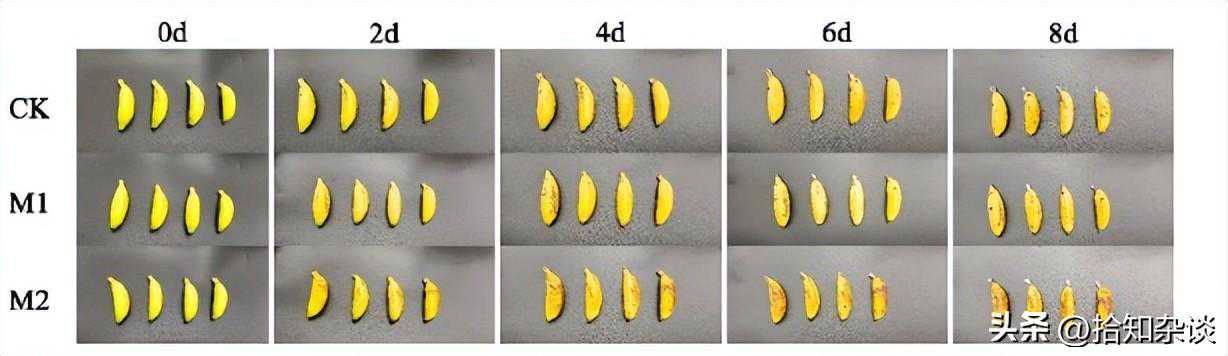 随着储藏时间的变长,香蕉颜色逐渐变为黄褐色,香蕉柄处逐渐变黑且有霉菌生长;在同一储藏时间下,M2组较M1和CK组黄褐色略深一点。