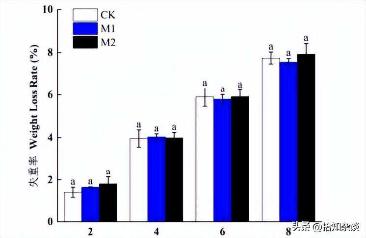 表示香蕉失重率随储藏天数的延长而上升,而同一时间下M1、M2、CK组不存在显著性差异。