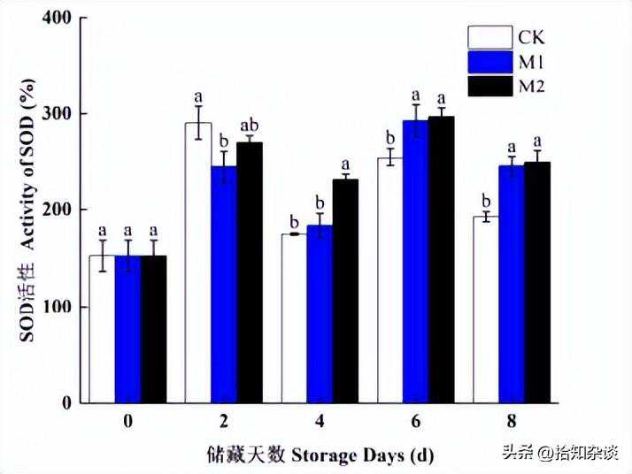 在处理初期三组对应的酶活性没有明显的差异,但SOD酶活性在M1处理后的4d和6d分别比CK组增加0.05%和15.0%,而M2处理后较CK组分别增加32.0%和16.6%,达到差异显著水平,其中2-4d时M1与M2之间达到显著性差异,6-8d时M2略优于M1。
