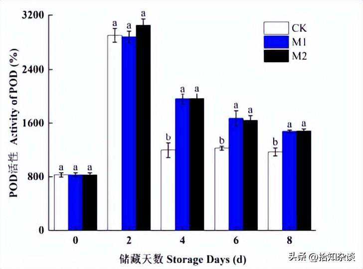 POD可去除破坏植物细胞正常功能的过氧化氢和过氧化离子,从而减轻植物细胞的氧化损伤。综上说明,涂膜处理有助于提高香蕉果肉的POD活性,从而增强果肉的抗氧化能力。