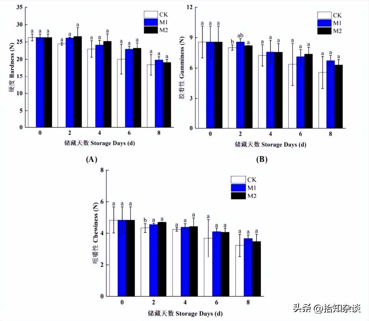 图4-5的c图代表香蕉果肉的咀嚼性呈下降趋势,较CK组,M1和M2组有利于缓解咀嚼性的下降,M1和M2组之间无显著差异。