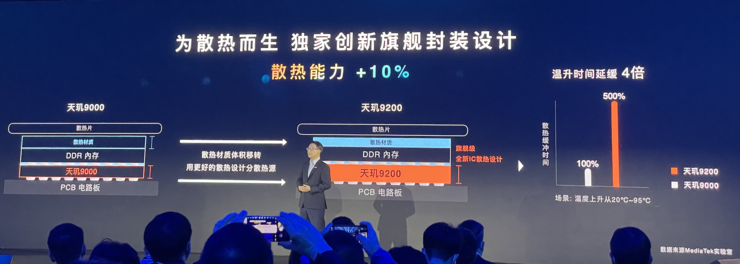 显然,今年天玑9200的CPU主要的目标是提升能效,降低功耗。为了提升天玑9200的整体散热表现,联发科也从封装技术入手,将天玑9200的散热能力提升了10%,从20摄氏度到95摄氏度的温升时间延缓了4倍。