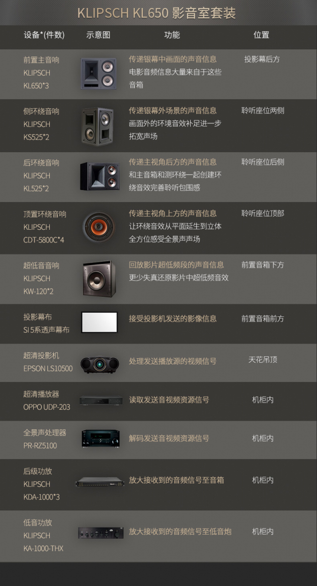 此家庭影院套装整体解决方案中,影音设备全部采用美国Klipschorn®(杰士)系列产品,套餐价:345699元。