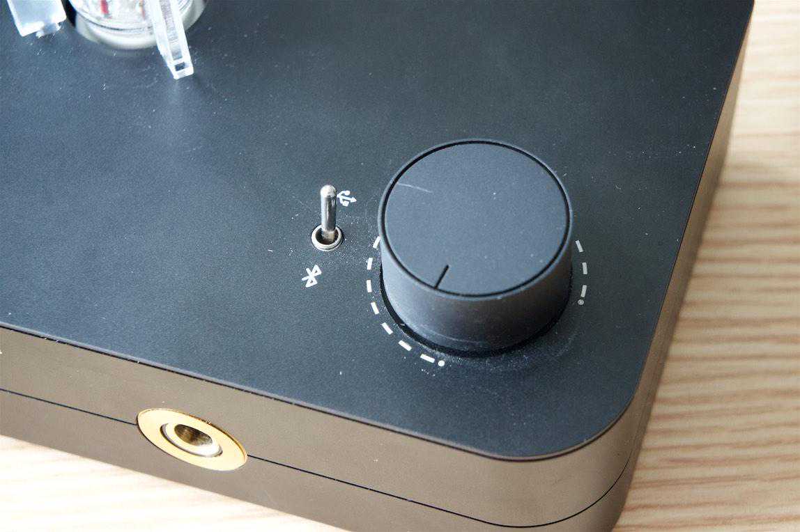 与之相对的右下角是旋钮型的电位器,AUNE倒没有把电源开关整合到电位器里,而是选择在机身背面另外用一个拨杆开关来负责,因此电位器唯一的功能就是用来控制音量大小。而在它旁边的拨杆是用来切换USB和蓝牙两种输入方式的,刚开始时我是有点小不习惯的,但慢慢就会发现即便在昏暗时,凭借胆管散发出来的光线,也能通过拨杆的位置一眼就辨别出来当前的连接模式。