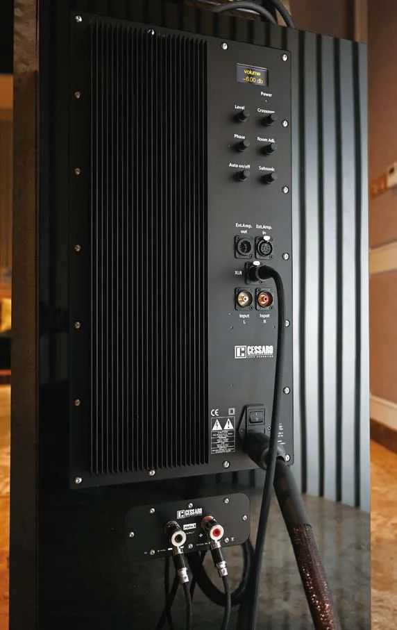 ●越来越多的高级音箱使用半主动式有源设计,也就是超低音有源,中高音无源设计,Cessaro可以说是走在业界前端的,而最新的第三代Alpha重新设计可根据环境空间精细微调电平、相位、分频点以及环境驻波的AB类功率放大器,由箱体背后的电子分频1200瓦AB类功放单独驱动,使其16英寸TADTL160A/B超低音单元轻松下潜到25Hz,远胜之前的产品。