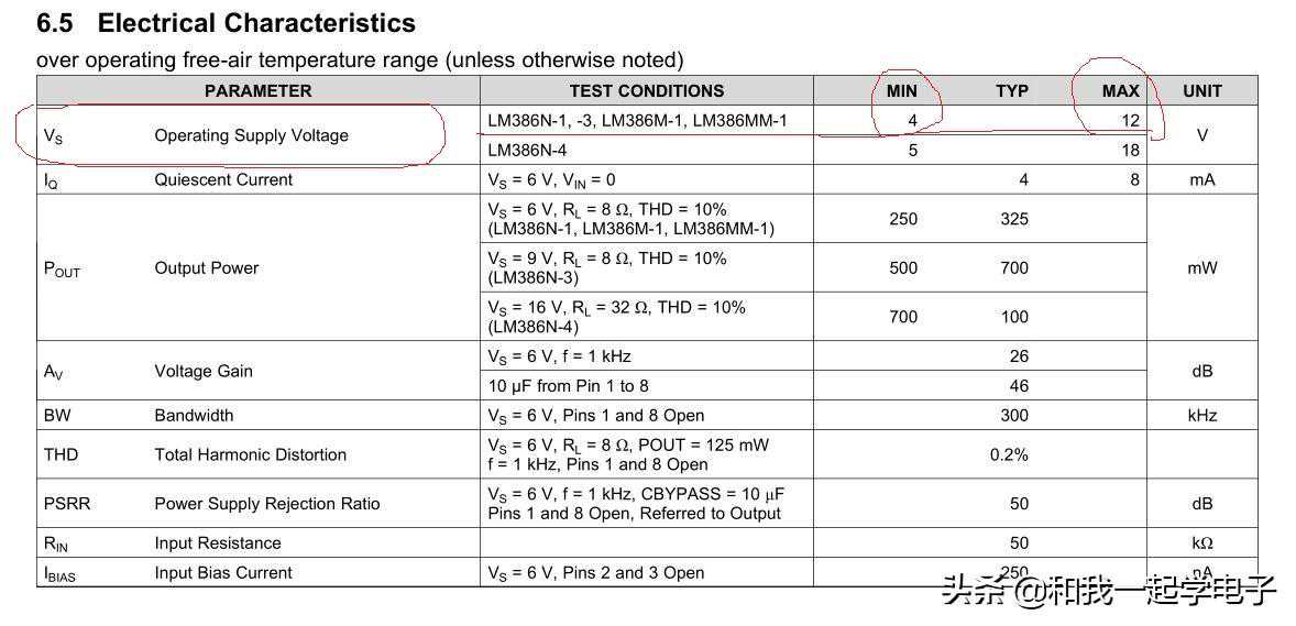 首先一款芯片是否适合使用,最重要的是芯片的使用电压范围,从数据手册关于芯片电气参数的部分里面,我们可以看到作者使用的LM386(后缀为N)电压范围为4V——12V,所以是符合设计要求的