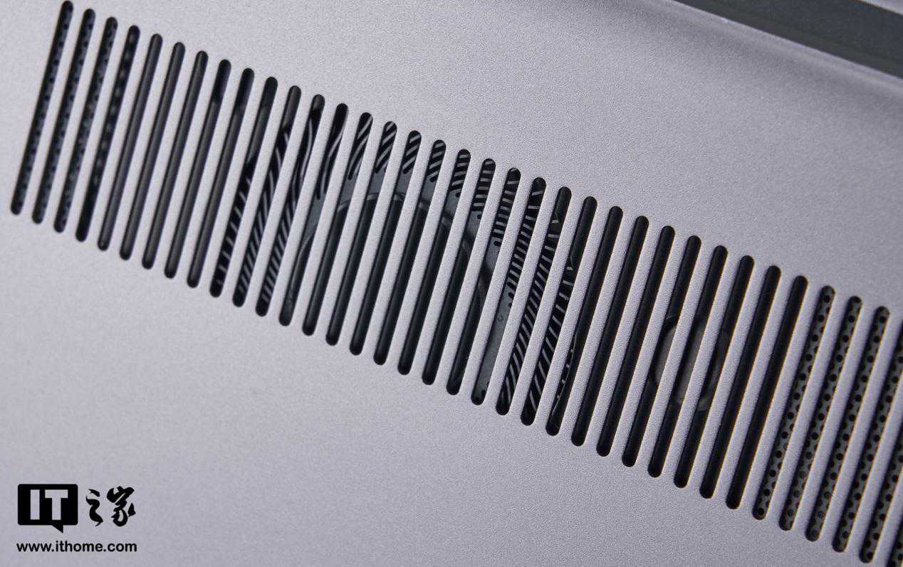 开孔内部可以看到防尘网和一个散热风扇。再下面还有一组左右对称的防滑脚垫和扬声器开孔。