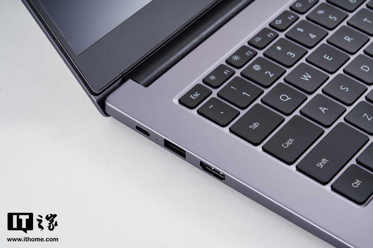 侧边的IO接口上,机身左侧有一个兼具充电和数据传输的USB-C接口,一个的Type-A接口和HDMI接口。
