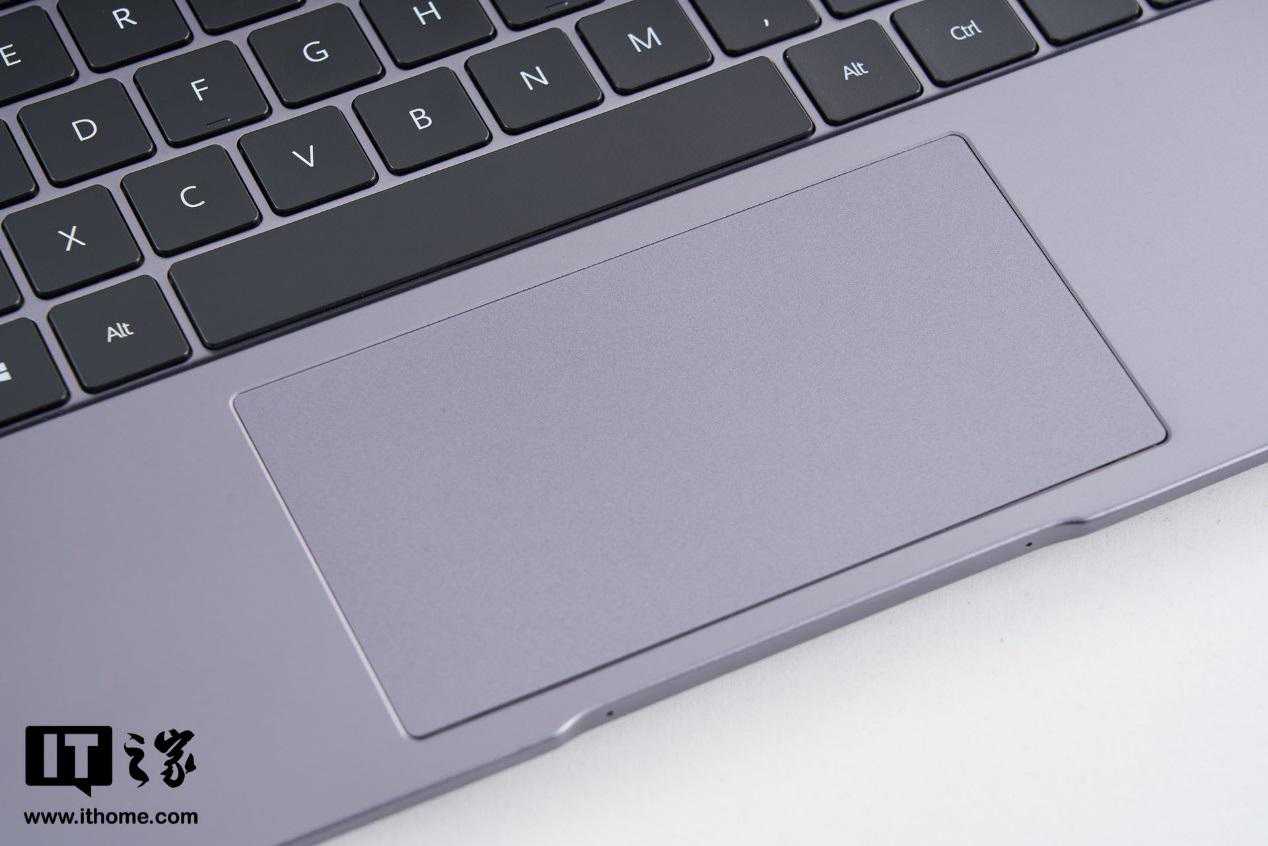 视觉方面,由于将常见的摄像头部分挪到了键盘部分,因此这块14英寸1920x1080FHD分辨率的IPS屏幕做到了3面等宽窄边框以及84%的屏占比,并拥有16:9的比例和157ppi,屏幕表面进行了雾面处理,下边框的部分也有一个HUAWEI标识。