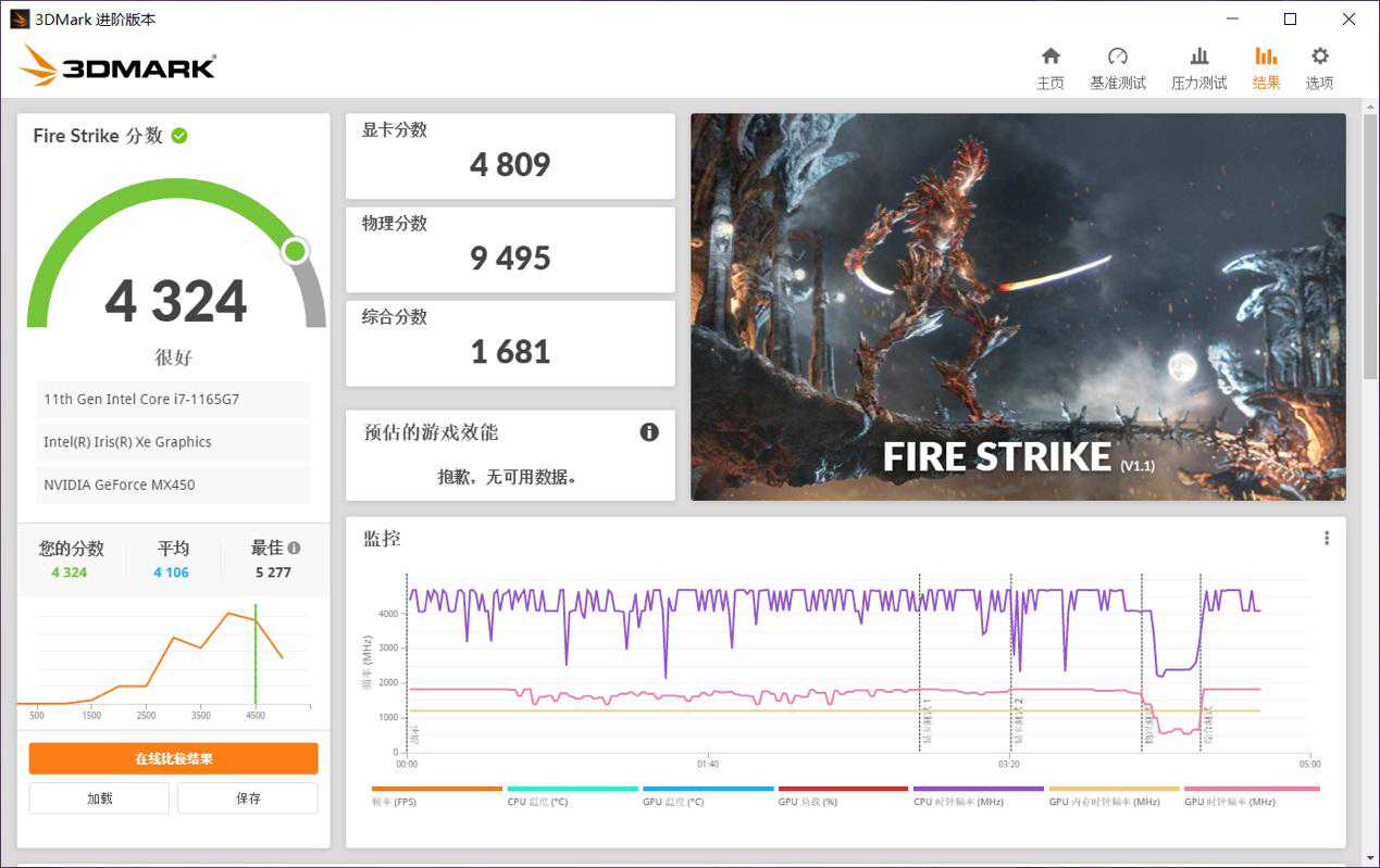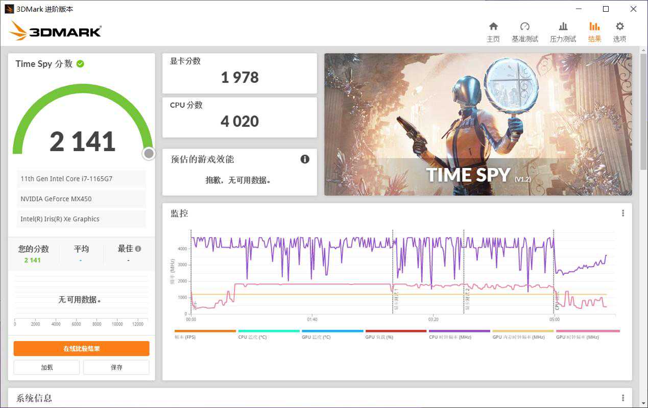 我们照例使用3DMark进行简单跑分。最终在TimeSpy中得到了1978分的图形分,而在FireStrike中得到了4809分的图形分,这组分数与采用GDDR6显存、25W功耗的MX450相比还有点差距,不过相比MX350还是有不少提升的。