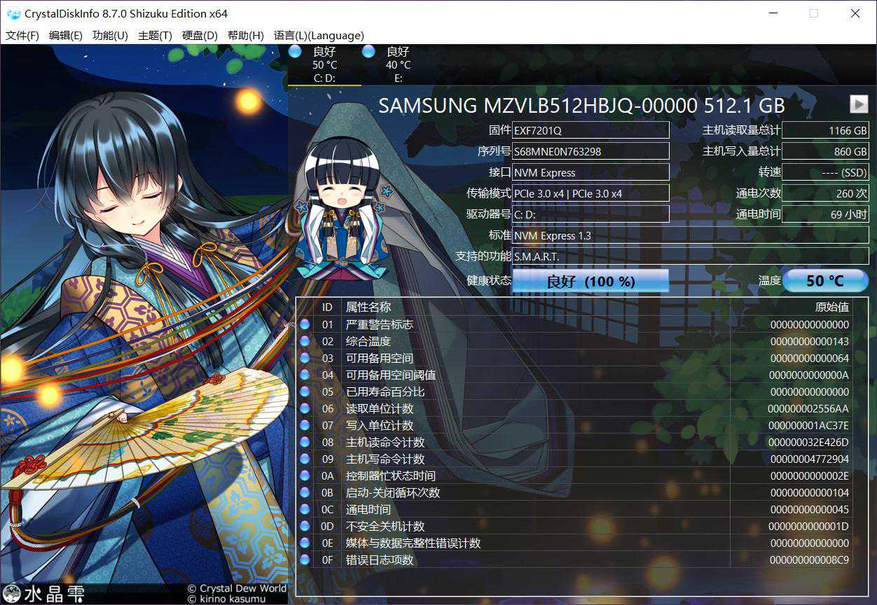 硬盘部分我们通过CrystalDiskInfo查询发现,它的型号是三星的MZVLB512HBJQ-0000,也就是大家耳熟能详的PM981a,这块SSD的性能表现非常出色,具体的读写速度大家可以参考下CrystalDiskMark的跑分成绩。
