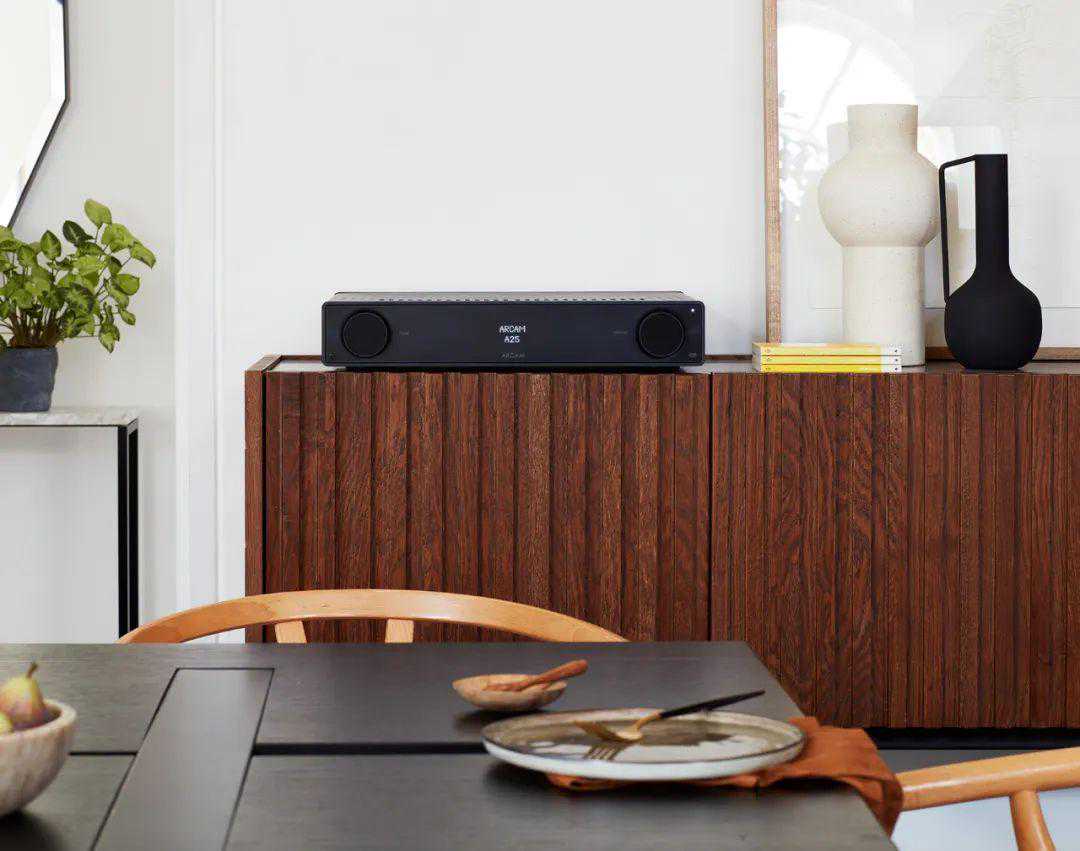ARCAMA25合并功放输出功率2x100瓦(8Ω)、165瓦(4Ω),内置ES9280APRODAC高品质解码,配备Hi-res音频USB-C输入,几乎所有数字音频解码一网打尽,除了支持光纤、同轴输入外,还支持高分辨率的384kHz、352.8kHz、192kHz、176.4kHz、96kHz、88.2kHz、48kHz等数字采样频率,甚至可通过USB-C输入实现DSD64到DSD128直至目前最高规格的DSD1024解码。