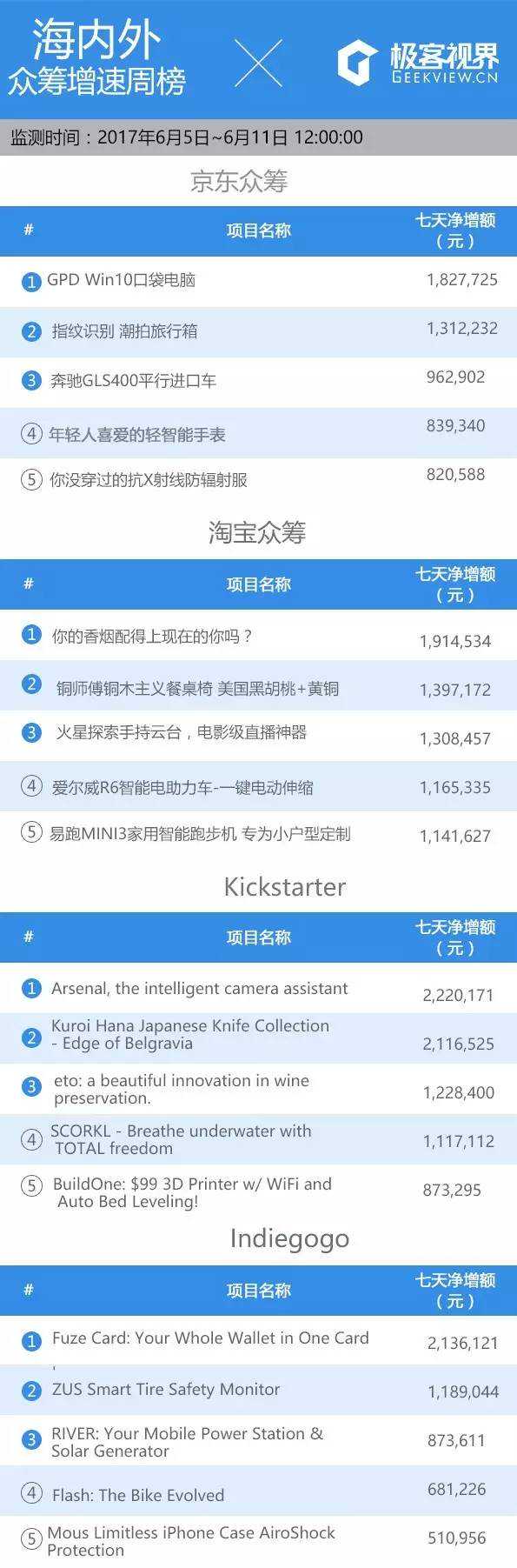 众筹排行榜看完了超人音箱,我们再来看看本周国内外有哪些热门项目: