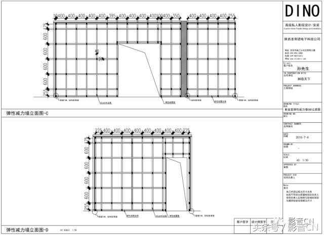 视听室空间信息:长宽高为7.9×4.3×3.1m。为了保证有最佳的黄金比例,同时满足前墙有足够的空间暗藏低音炮,我们在前墙用弹性减力墙结构做了一个巨大的音障墙,将房间长度缩短至7.3m,这样房间的长宽比为1.72:1,几乎接近完美的比例。